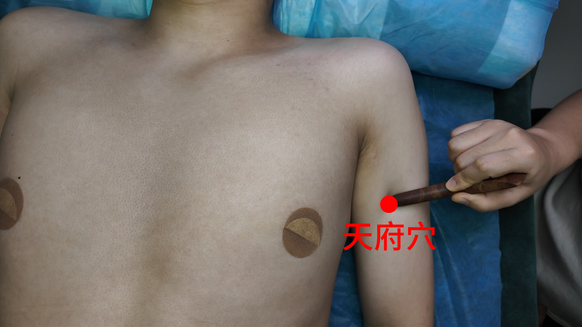 坐位,臂向前平举,俯头。鼻尖接触上臂内侧处即为本穴。