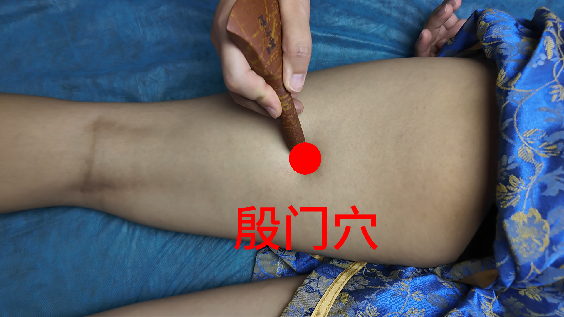 取臀后横纹中点及腘横纹中点之连线的中点(臀横纹至膝中可作14寸折量),由此往上1横指处为取穴部位。