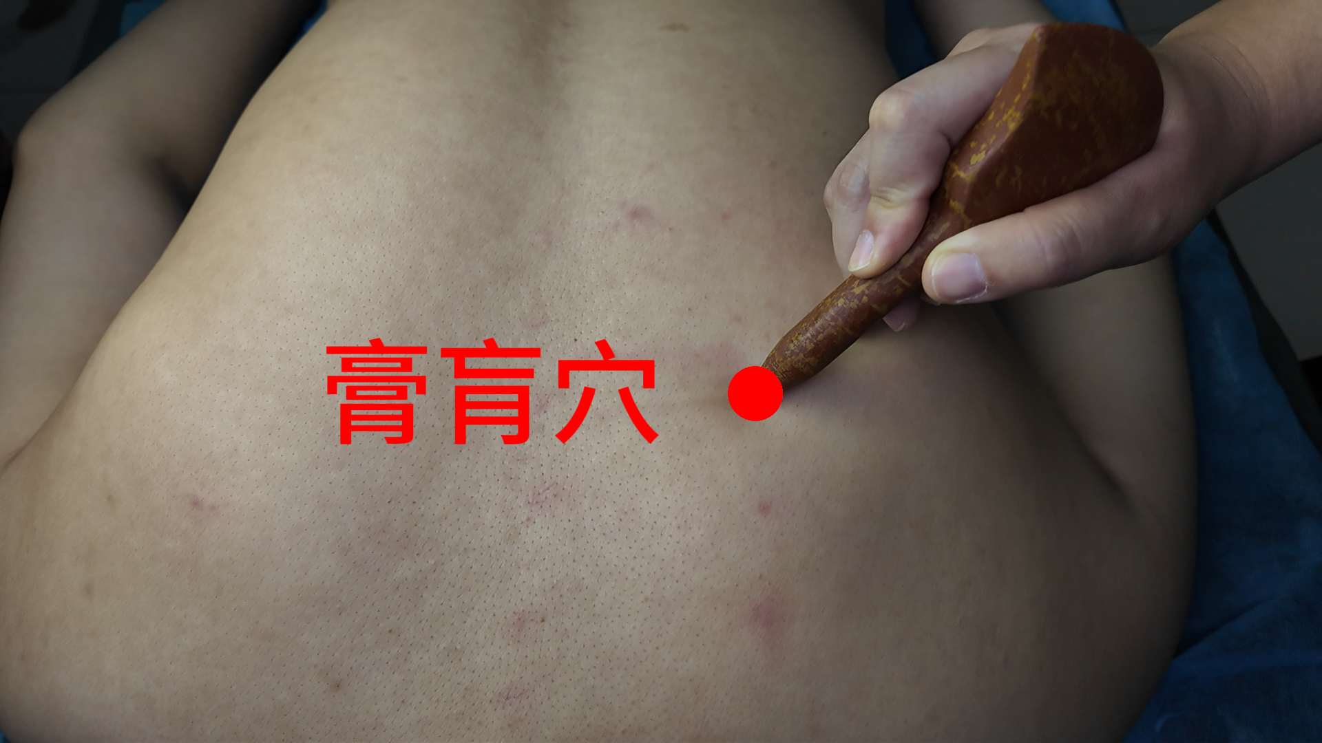 第1步:正坐或俯卧位;第2步:在上臂自然下垂时贴于胸侧壁时确定肩胛下角;第3步:从两侧肩胛下角连线与后正中线相交处所在椎体为第7胸椎;第4步:从第7胸椎棘突垂直向上推3个椎体棘突即是第4胸椎棘突;第5步:在第4胸椎棘突下作一水平线,此水平线与肩胛内缘的交点即为本穴。《针灸资生经》取穴法:令病人两手交在两膊上,胛骨遂开,其穴立见,灸之。