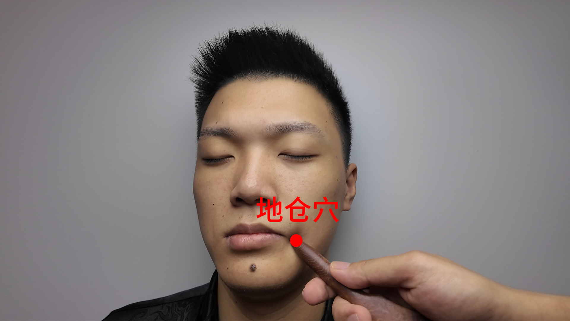 正坐平视,瞳孔直下垂线与口角水平线相交点处。