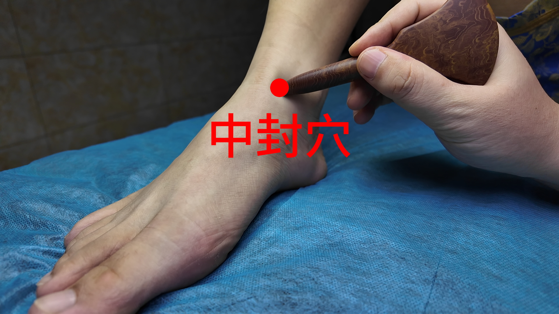第1步:坐位或仰卧位,拇趾上跷;第2步:足背内侧可见一大筋(胫骨前肌腱),在其内侧、足内踝前下方可触及一凹陷处,即为本穴。