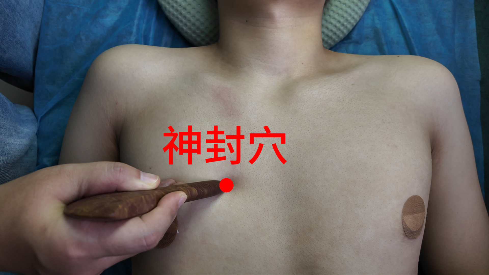 仰卧位。在平乳头的肋间隙(即第4肋间隙)中,由前正中线旁开量2横指(拇指),按压有酸胀感处,即为本穴。