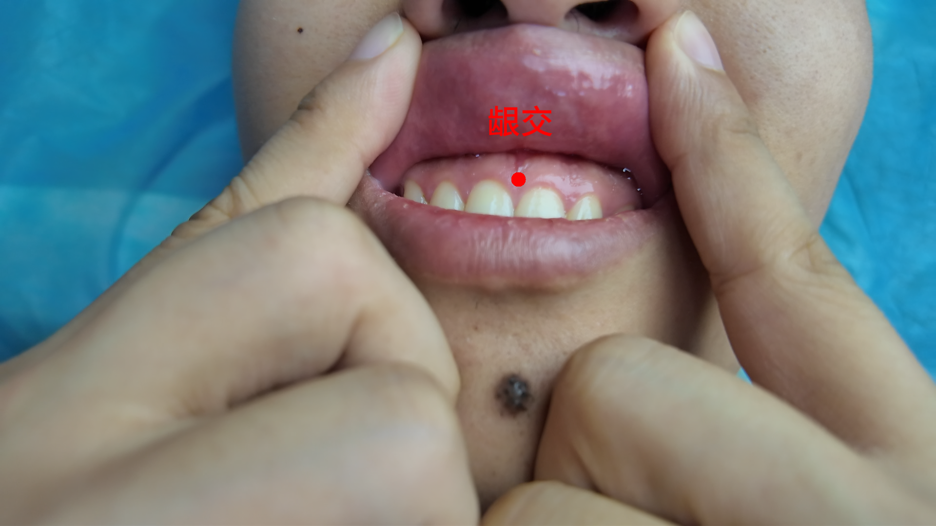 正坐仰头。提起上唇,上唇系带与上牙龈的交点。