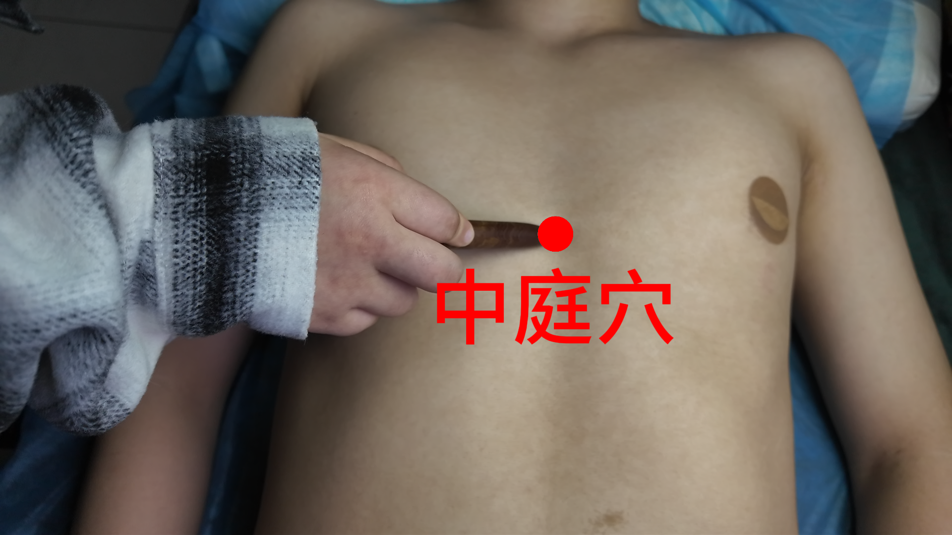 在胸部,前正中线上,平第5肋间,即胸剑结合部。