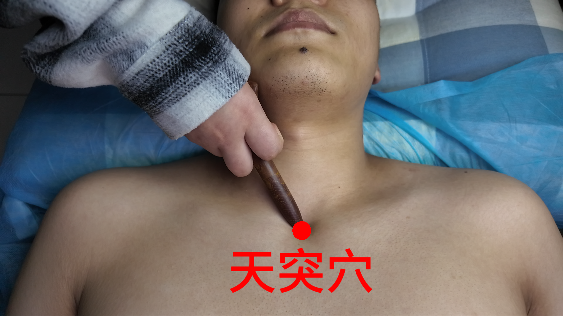 仰靠坐位。在颈部,当前正中线上,胸骨上窝中央。