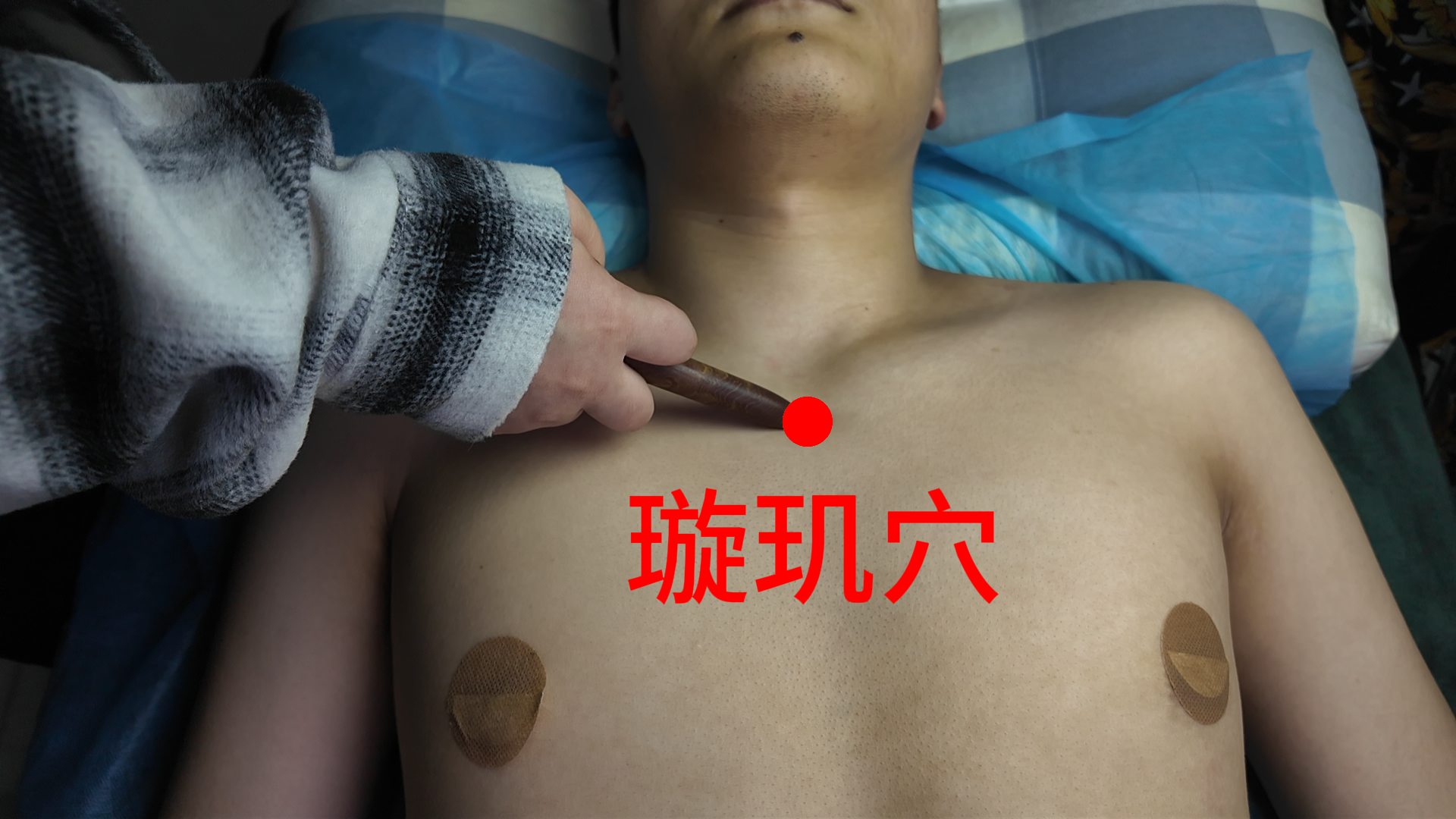 仰卧位或仰靠坐位。从天突(参见“天突”)沿前正中线向下量1横指,即为本穴。