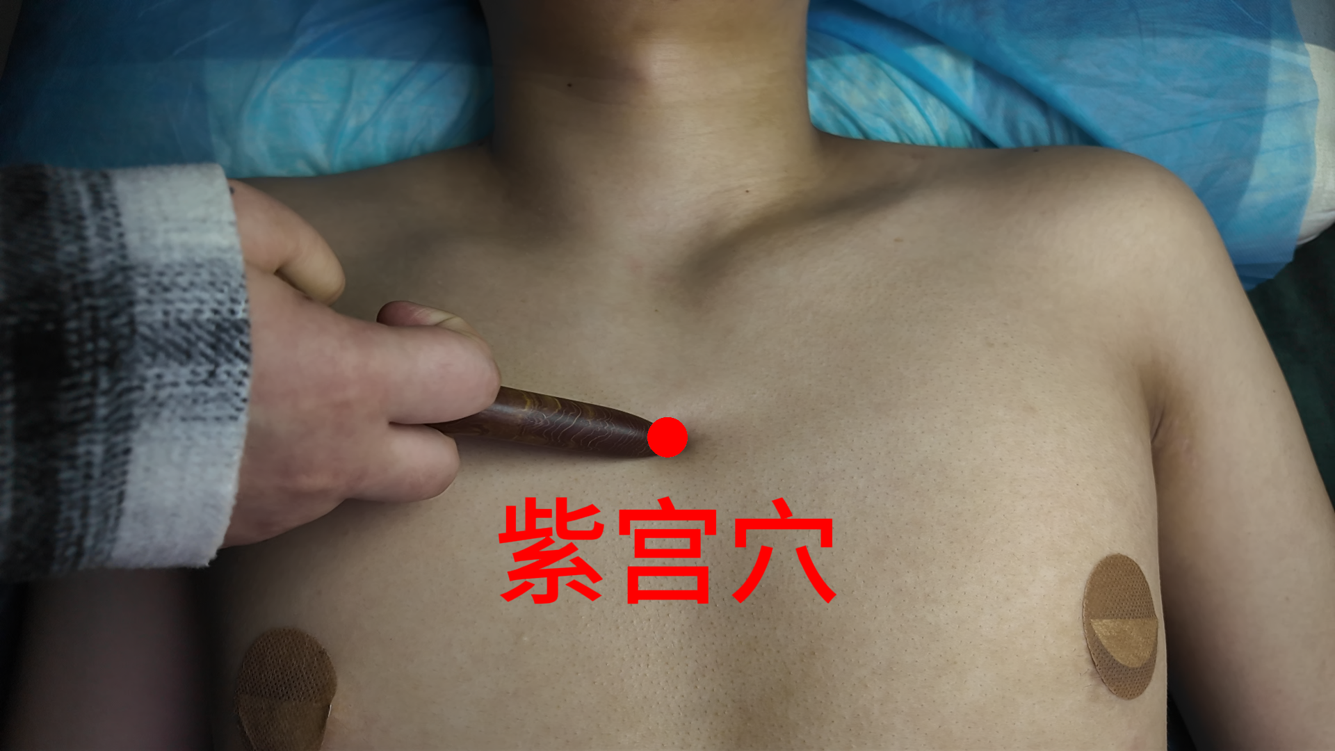 仰卧位或仰靠坐位。从乳头沿垂直线向上推2个肋间隙(即第2肋间隙),该穴横平第2肋间,在前正中线上。