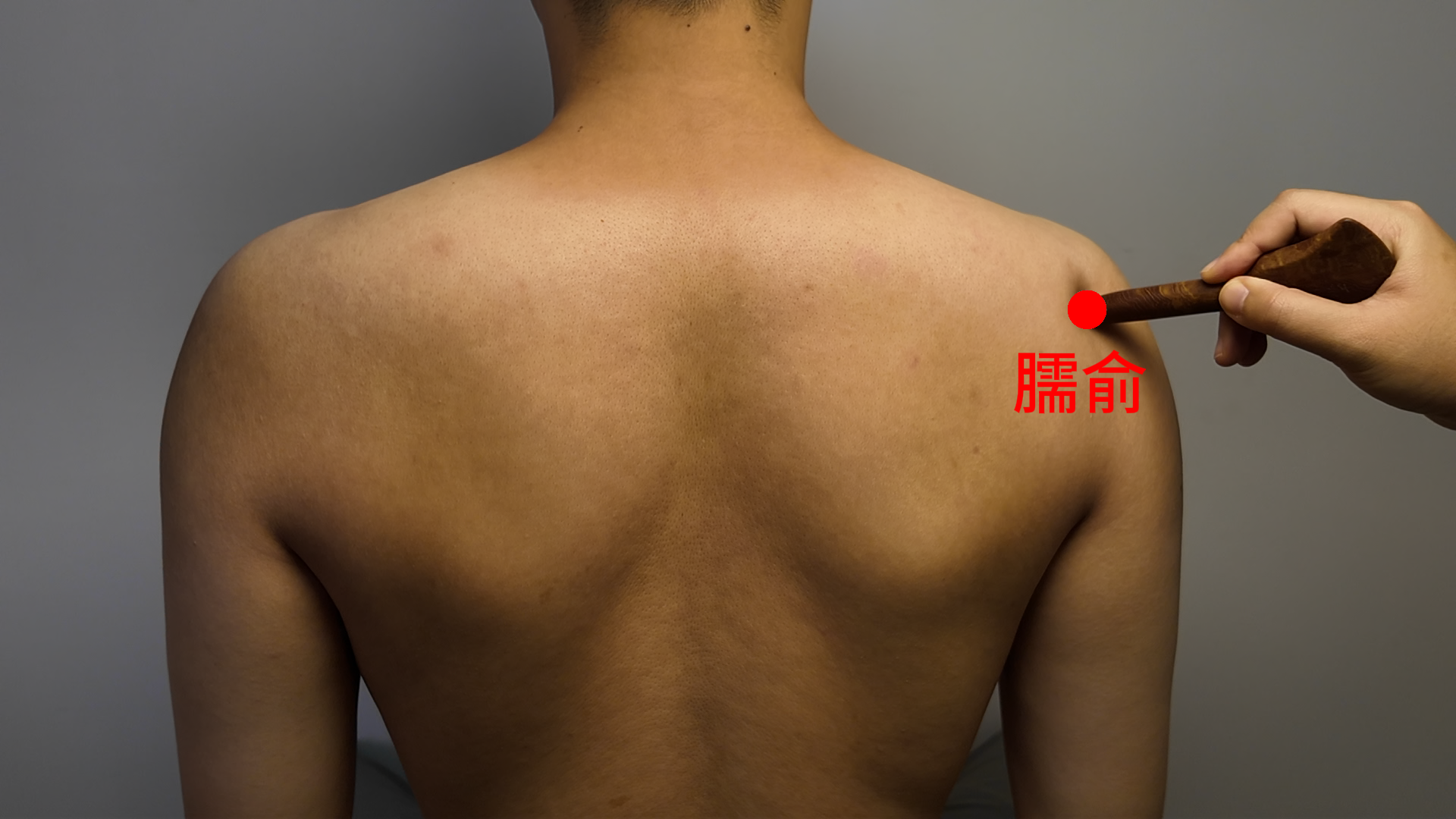 正坐垂肩,上臂内收,用手指从腋后纹头端肩贞穴垂直向上推至一块横向的骨头(即肩胛冈)下缘,按压有酸胀感处,即为本穴。