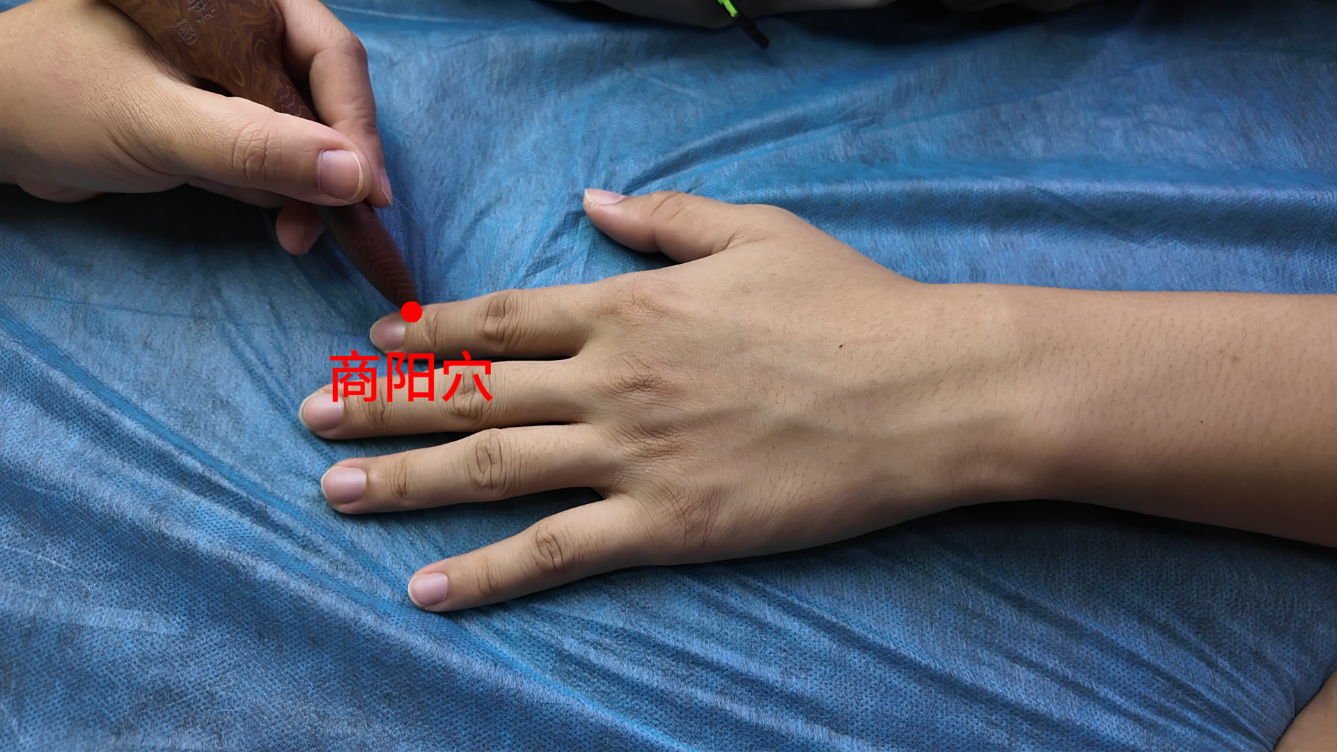 坐位,伸指俯掌。沿手食指爪甲底部与拇(桡)侧缘引线(即掌背交界线,或称赤白肉际处)的交点处,距指甲角0.1寸,即为本穴。