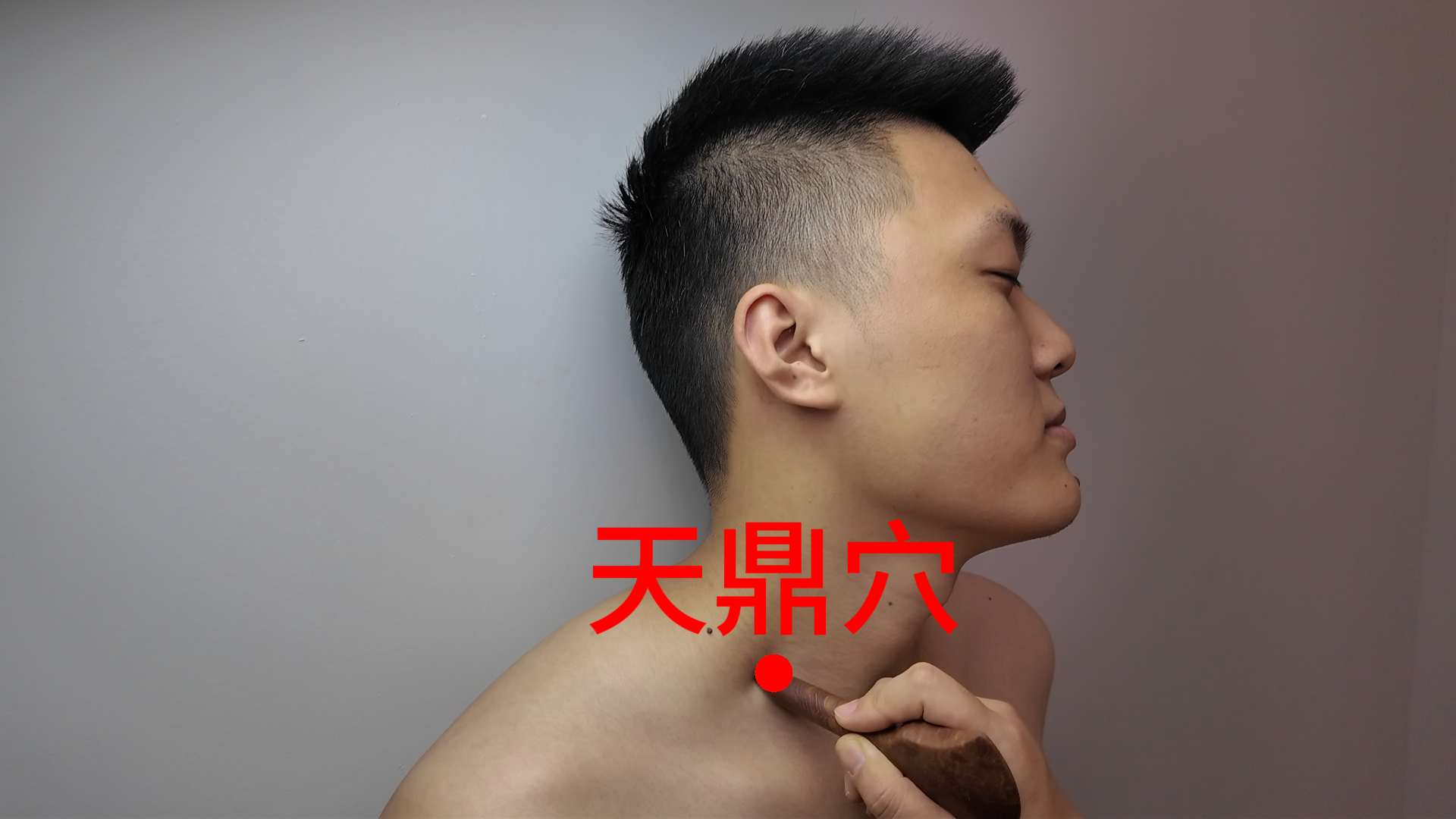 第1步:正坐位,头微侧;第2步:确定伏突穴:平喉结的胸锁乳突肌肌腹中点即为扶突穴。第3步:确定缺盆穴:过乳头垂直线直上可触及一长骨(锁骨),此骨上方凹陷中点即为缺盆穴;第4部:扶突与缺盆连线的中点,即为本穴。