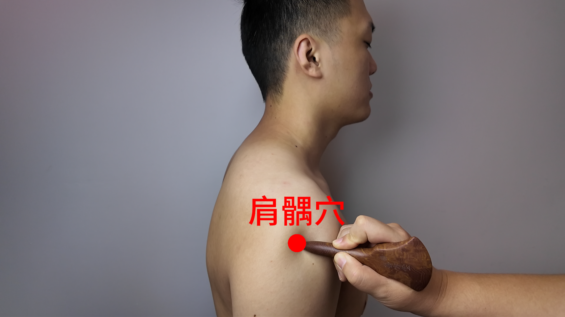 第1步:坐位,上臂外展至水平位;第2步:在肩部高骨(锁骨肩峰端)外,可见肩关节上出现两个凹陷;第3步:前面的凹陷,即为本穴。