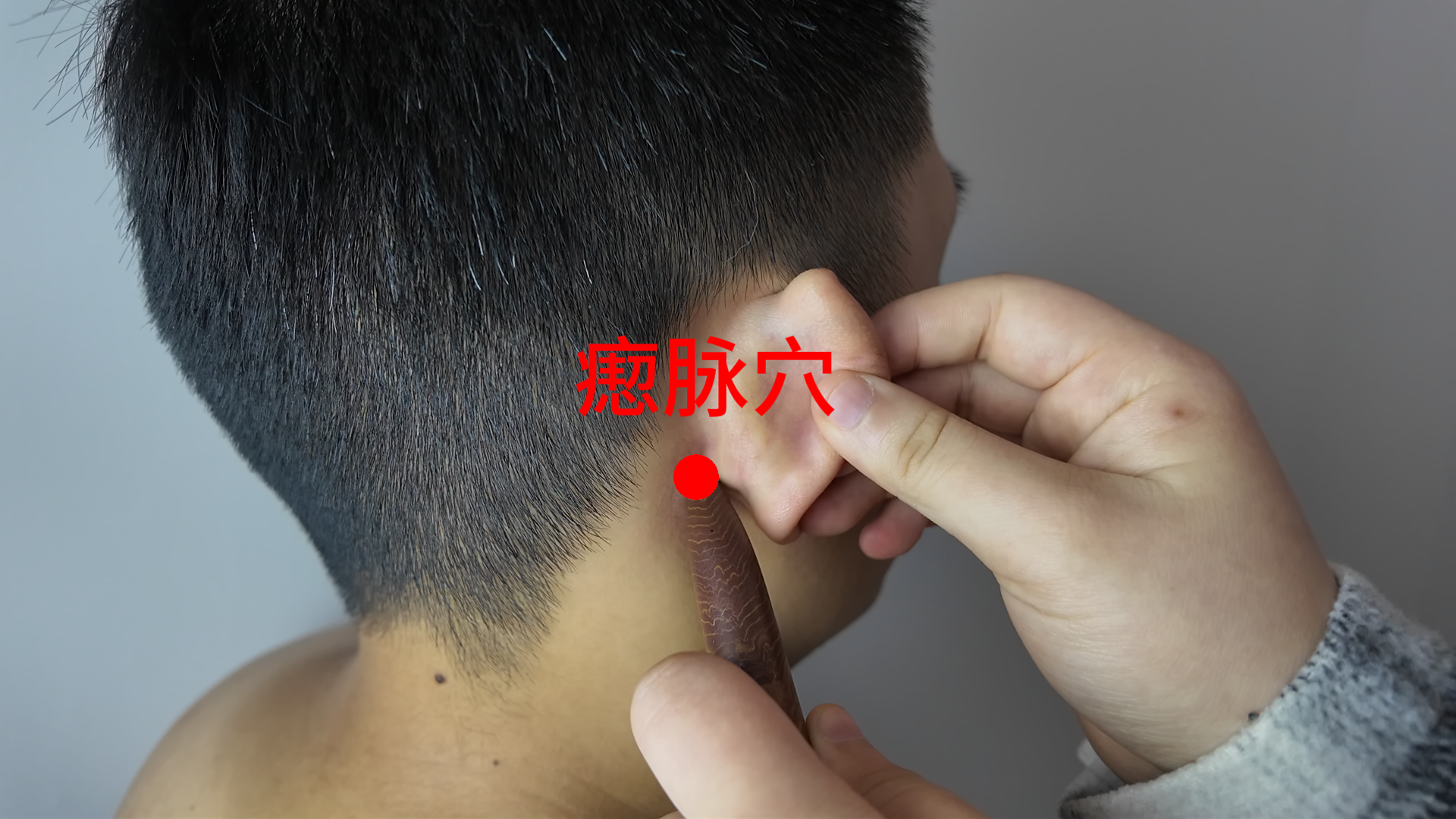 正坐或侧卧位。耳后发际与外耳道口平齐处,即为本穴。